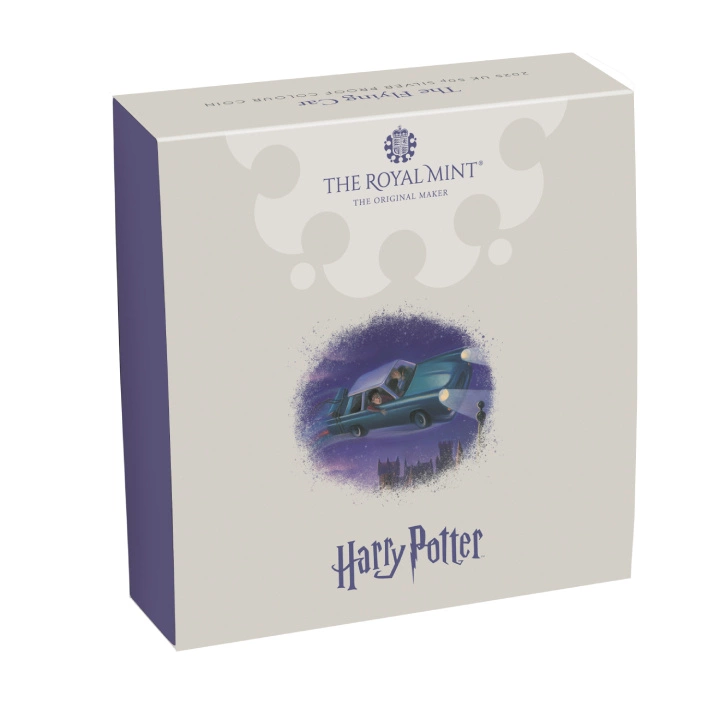 Harry Potter: The Flying Car Coloured 50p Silver 2025 Proof commemorates one of the most iconic events from Harry Potter's second year at Hogwarts School of Witchcraft and Wizardry. It depicts the moment when the young wizard, along with his friend Ron Weasley, after the passage to Platform Nine and Three-Quarters is closed, decides to take an extraordinary journey in the enchanted Ford Anglia to reach the school.