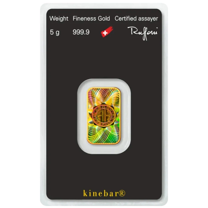The Kinebar Argor Heraeus 5 gram gold bar is an innovative investment product made of 999.9 fine gold, equipped with unique Kinegram technology that enhances protection against counterfeiting. This makes it not only a valuable item but also a secure and reliable investment instrument. Each bar has an individual serial number and is contained in original, sturdy packaging that facilitates authenticity verification and product specification checks.