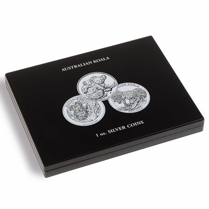 The purchase of a cassette will be ideal for storing all Koala coins, regardless of the year of mintage. It was made of the highest quality materials and with attention to every detail. The product has dimensions of 305 x 245 x 30 mm. On the lid and on the inside of the cartridge is the silver inscription "AUSTRALIAN KOALA 1 OZ SILVER COINS". The inside of the cassette has been sent in satin and has a magnetic closure. The manufacturer of the cassette is Leuchtturm.