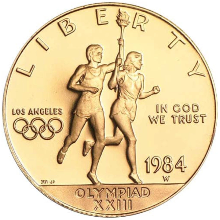 The obverse depicts two Olympic runners holding a torch. Below are the year of the coin's issue and the inscriptions "LOS ANGELES", "LIBERTY", "IN GOD WE TRUST", "OLYMPIAD XXIII"