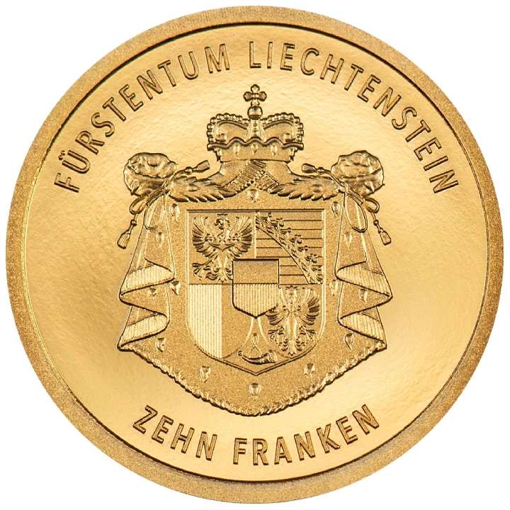 The obverse features the coat of arms of the "FÜRSTENTUM LIECHTENSTEIN". The obverse also includes the denomination "ZEHN FRANKEN".