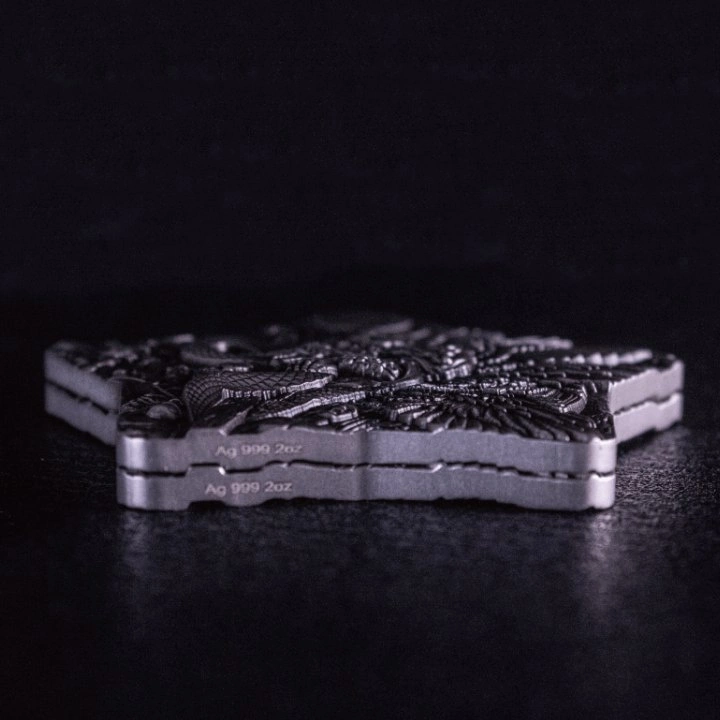 The specimen is minted is Ag silver.999, weighing 2 troy ounces in stackable, high relief and antiqued standards. The cylinder has dimensions of 60.0 x 57.4 mm.
