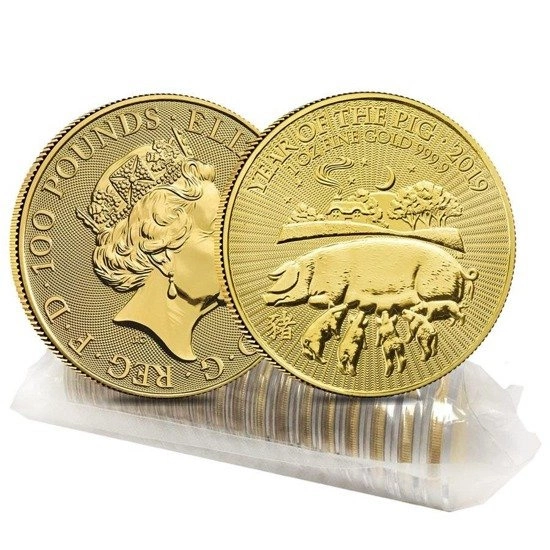 The Year of the Pig 1 oz Gold 2019 is another coin in the Lunar series issued by the UK's Royal Mint. The coin collection depicts animals from the Chinese lunar calendar and contains a total of six coins. The series was launched with the Year of the Horse in 2014, the Year of the Pig being the twelfth and final sign of the Chinese zodiac. The gold coin depicts a view associated with the English countryside, a house placed under a dreamy night sky and a pig feeding its young. This image suggests tranquillity and perfectly reflects the character of people born under the sign of the pig, who are considered to be gentle and warm-hearted people.The 1 ounce gold bullion coin has been made from pure 9999 bullion. The obverse features an image of Queen Elizabeth II of England, designed by Jody Clark, and information about the coin's face value (£100). The reverse depicts the 12 animal of the Chinese lunar calendar, information on purity and silver weight. Do you need help? Do you have any questions?Ask a question and we'll respond promptly, publishing the most interesting questions and answers for others.