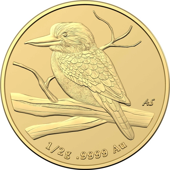 The 2022 Kookaburra 1/2 gram Gold Mini Money coin is the second issue in the Royal Australian Mint's Mini Money series. Depicting an Australian kingfisher, the coin was struck in pure Au.9999 bullion, weighing 1/2 gram and measuring 11.15 mm in diameter. The issuer of the coin is the Australian mint, The Royal Australian Mint. Highlighting the Kookaburra's unique design is its limited mintage of only 5,000 pieces. The Kookaburra 2022 is produced with the utmost attention to detail, with the noteworthy fact that all pieces act as full legal tender in the issuer's country and are guaranteed by the Australian government as to the legality, purity of the bullion and the origin of the metal. The product was placed in the original certipack. The Averse of the coin features an image of Queen Elizabeth II, designed by Jody Clark, inscribed "ELIZABETH II", "AUSTRALIA". On the obverse there is information about the face value and the year of issue of the coin.Rewers depict an image of Kookaburra sitting on a branch. The reverse also contains information on the bullion proof and weight of the coin. The designer of the reverse was Aleksandra Stokic.Designer