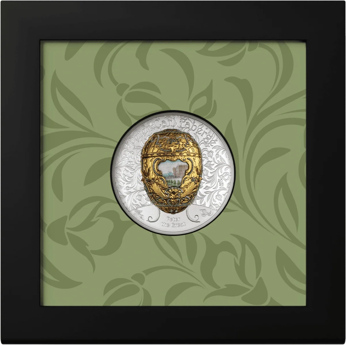 Reverse features the “Peter the Great” Fabergé Egg in high relief, with a sculptural height of 2.2 mm. Intricately decorated floral motifs and ornamentation surround the egg, while gilded accents, polished surfaces, and vivid colors create a regal effect. Inside the egg is a finely detailed depiction of the Winter Palace, highlighting the historical connection to Peter the Great. The design is completed by the engraved inscription “Peter the Great” and a reeded edge, adding elegance and sophistication.
