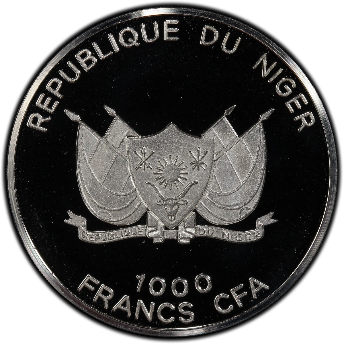 The obverse features the coat of arms of the Republic of Niger and the inscriptions “REPUBLIQUE DU NIGER” and “1000 FRANCS CFA,” confirming the issuing country and the coin’s face value. The obverse layout follows a classic numismatic orientation.