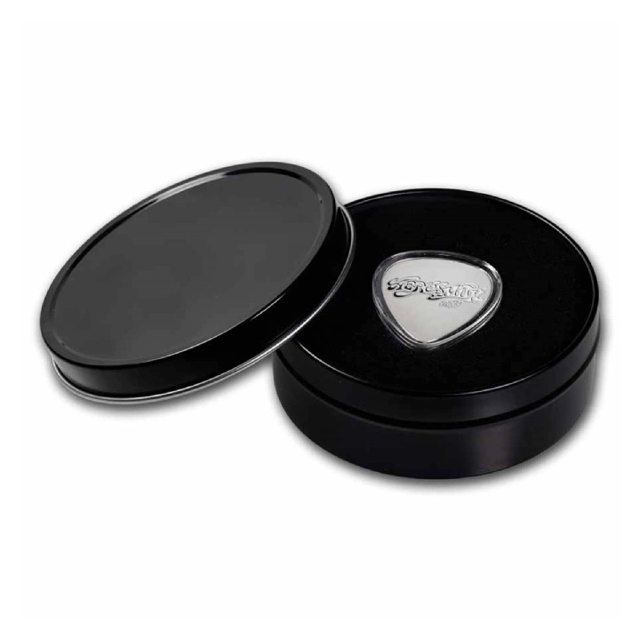 The coin was struck in pure Ag.999 bullion, weighing 10 grams and measuring 31.5 x 27.4 mm, in the shape of a guitar pick. It is a coin with an imitation mintage of 500 pieces. What's more, each coin acts as a fully fledged means of payment and comes with a guarantee from the Niue Government as to the legality, purity of the bullion and origin of the metal. The Overt depicts the Niue coat of arms along with information on the face value, year of the coin, weight and purity of the bullion.