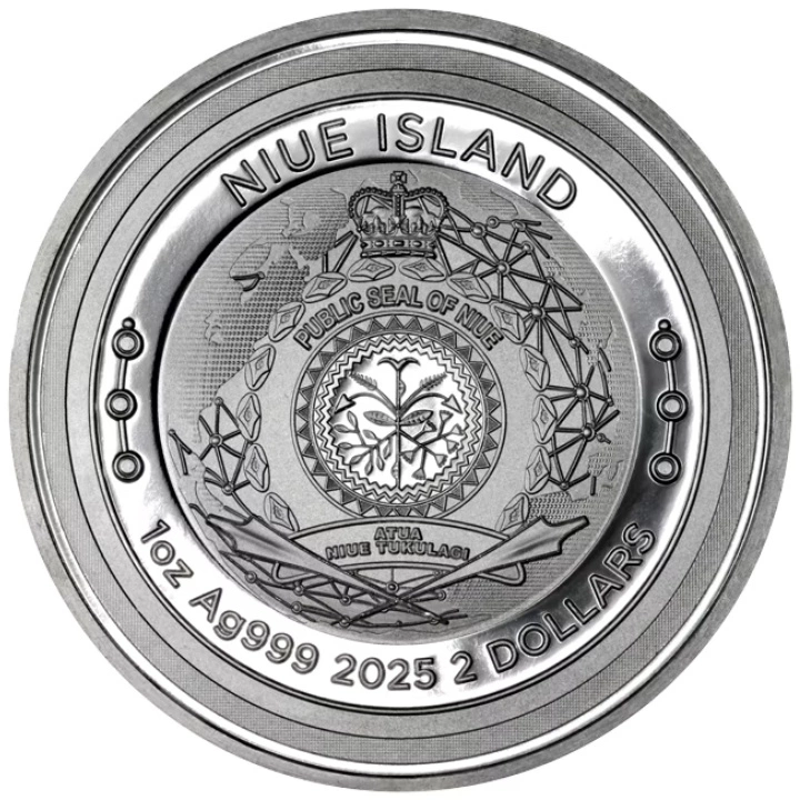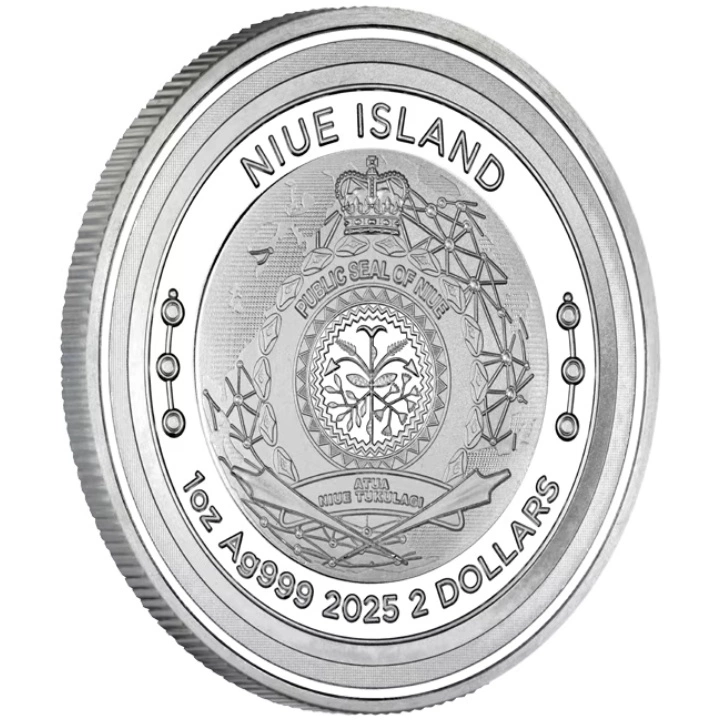 The obverse of the silver coin features the coat of arms of Niue, with the inscription "NIUE ISLAND 2025." It also includes information about the nominal value, weight, and purity of the metal.