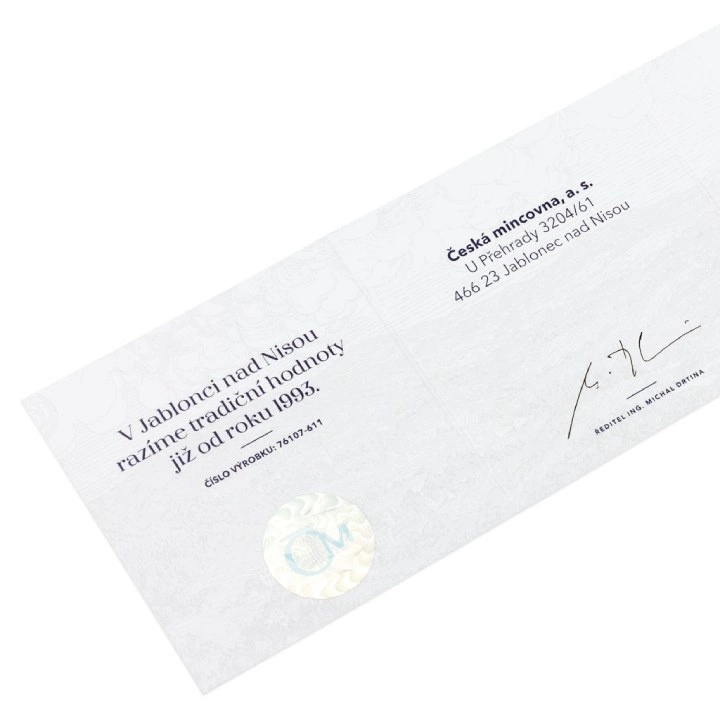 The gold bullion coin was struck from pure Au.9999 bullion, weighing 31.1 grams and with a diameter of 37 mm, in proof standard.The product has a mintage of only 200 pieces. This unique piece was designed by Vojtěch Dostál, DiS. and produced by the Czech Mint, as well as being official legal tender in Niue. The coin is guaranteed as to its legality, purity of the bullion and origin of the metal. The product is delivered in the original box together with a certificate of authenticity.