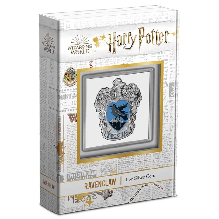 The Niue: Harry Potter - Ravenclaw Crest coloured 1 oz Silver 2021 Proof is a sterling silver piece that was created in collaboration with Warner Bros. Consumer Products and features the crest - one of the four houses at Hogwarts School of Magic and Wizardry, founded by Rowena Ravenclaw. This unique issue has a strictly limited mintage of only 5,000 pieces. The silver coin is struck in pure Ag.999 bullion, weighing 1 troy ounce and measuring 36 mm x 29.5 mm, in proof standard. The renowned mint manufacturer, New Zealand Mint, is responsible for its production. In addition, each piece is guaranteed by the New Zealand Government and is legal tender in the issuing country.The obverse of the silver coin features an image of Queen Elizabeth II, designed by Ian Rank-Broadley, along with information on the face value, year of mintage, weight and purity of the bullion. The Rewers shows a coloured coat of arms featuring a raven and the inscription "RAVENCLAW".Do you need help? Do you have any questions?Ask a question and we'll respond promptly, publishing the most interesting questions and answers for others.