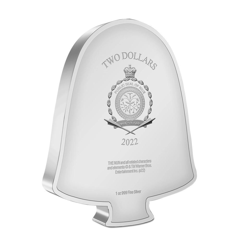 Niue: Horror - The Nun Chibi Coin Colorized 1 oz Silver 2022 Proof is a collector coin inspired by the demonic nun Valak from the Conjuring Universe. The reverse shows her in Chibi style—with exaggerated proportions, a large head, and a distinctive, terrifying facial expression that, despite the simplified form, still conveys the horror of this iconic character. The colorized design highlights the details of the habit and her menacing gaze, making the coin stand out within the entire series.
