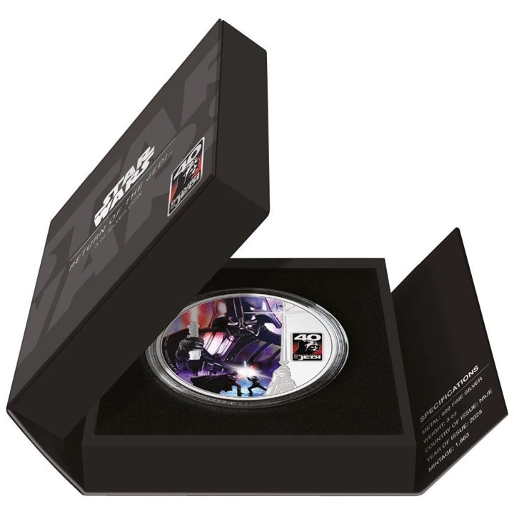 Rewers shows a coloured Darth Vader and duel with Luke Skywalker and information on the weight and purity of the bullion and the copyright owned by Lucas film Ltd.
