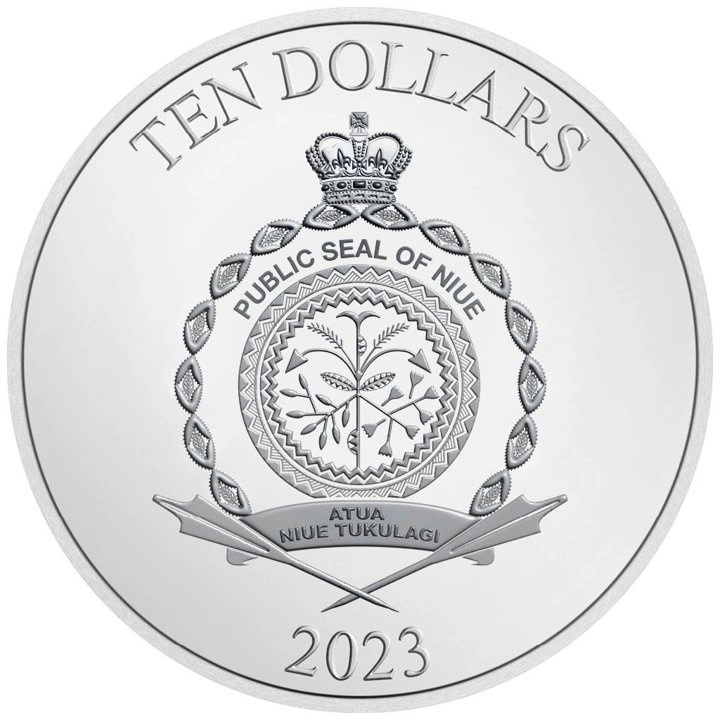 The coloured proofs were struck in pure Ag.999 silver with a weight of 3 troy ounces and a diameter of 55mm, in proof standard. The mintage of the product is 1,983 pieces. The producer of the pieces is the New Zealand Mint. The product is supplied in individual original packaging. The coins are legal tender in the issuing country. The Averse of the silver coin depicts the coat of arms of Niue and the face value and year of issue of the coin.