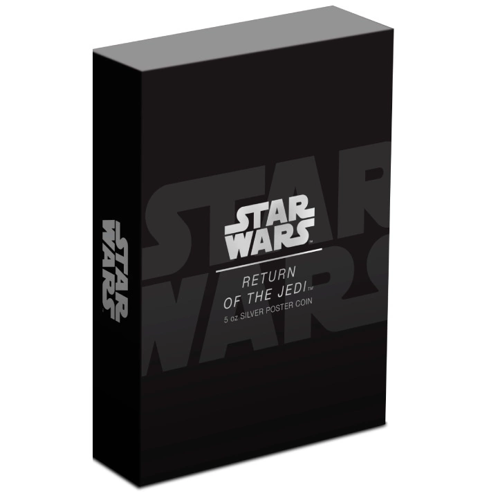 Rewers show the coloured characters from the Star Wars film, the inscriptions "STAR WARS, "RETURN OF THE JEDI" and information on the weight and purity of the bullion and the copyright owned by Lucasfilm Ltd.