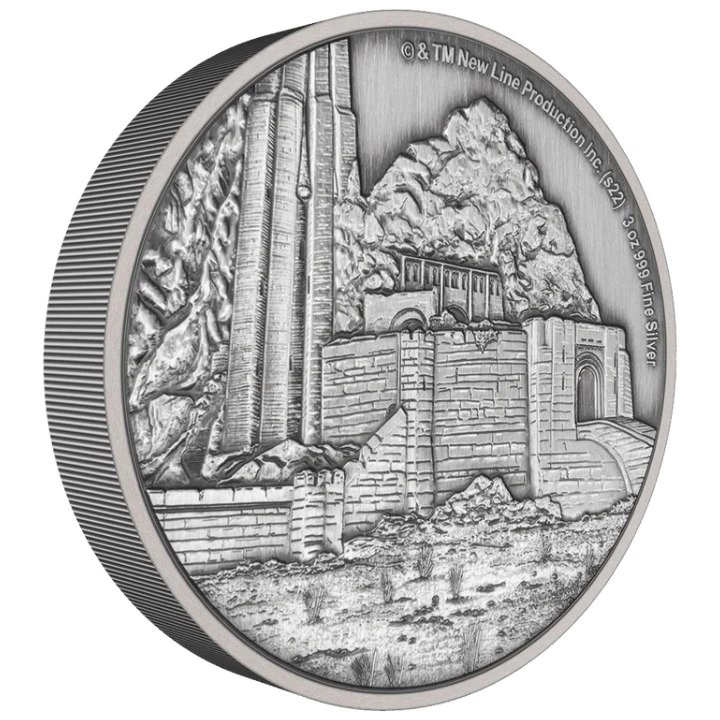 Niue: The Lord of the Rings - Helm's Deep 3 oz. Silver 2022 Antique Finish is an interesting silver piece for collectors and fans of the "Lord of the Rings" trilogy. The coin was created in cooperation with Warner Bros. Consumer Products and depicts the great fortress of Hornburg in Helmov Yar.