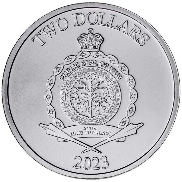 Awers monety przedstawia herb Niue oraz informację o dacie emisji i wartości nominalnej waloru.