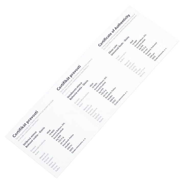 Niue: Universal Gods - Osiris 5 oz Silver 2022 is another coin in the "Universal Gods" series commemorating ancient gods from around the world. Valor presents Osiris. In Egyptian mythology, he was the god of death and reborn life and the great judge of the dead. His wife was the goddess Isis.