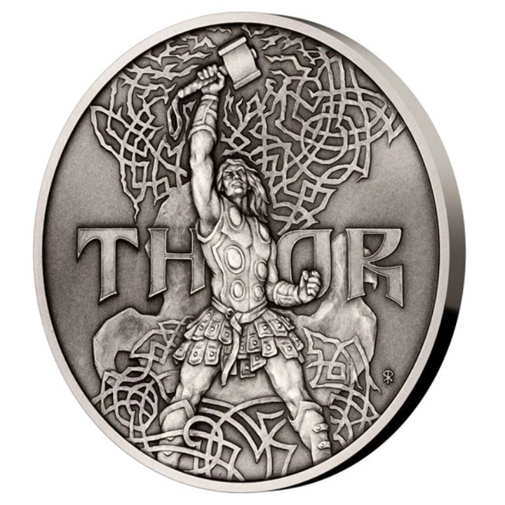 Reverse depicts the image of Thor holding a hammer - Mjöllnim above his head and decorative Nordic motifs. The reverse side bears the inscription "THOR".