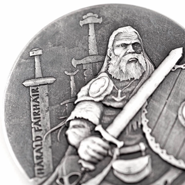 The coin was struck from pure Ag.999 bullion, weighing 2 troy ounces, with a diameter of 40 mm, in proof and antiqued standard. The silver coin was produced by the Scottsdale Mint, in a low mintage of 1999 pieces. The product is legal tender in the territory of Niue. The coin comes in its original certified packaging with an accompanying certificate of authenticity.The Overt of the silver coin depicts the likeness of Queen Elizabeth II and the coat of arms of Niue. The obverse also features information on the weight, purity of the bullion, country of issue, face value and year of mintage. On the reverse is depicted Harald Fairhair.