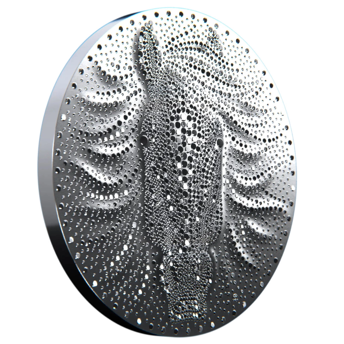 The coin's design features a forward-facing horse's head—calm, confident, and majestic. This motif, consistent throughout the series, symbolizes endurance, independence, and determination. The surface of the coin is adorned with thousands of tiny circles that reflect light, creating a sparkling effect that adds depth and dynamism to the horse's image.