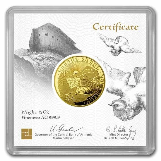 Złota moneta Arka Noego to popularny produkt inwestycyjny, wybity w wadze 1/2 uncji oraz czystości kruszcu Au.9999. Ten ciekawy walor jest emitowany przez Centralny Bank Armenii. Jednakże sam proces produkcyjny odbywa się w prywatnej, niemieckiej mennicy - Leipziger Edelmetall Verarbeitung. Monety z wizerunkiem Arki posiadają gwarancję rządu Republiki Armenii, co do ich legalności, czystości próby oraz pochodzenia kruszcu, a także są pełnoprawnym środkiem płatniczym na terenie tego kraju. Awers monety, zaprojektowany przez Eduard'a Kurghinyan, przedstawia Arkę na wzburzonym morzu, na drugim planie widnieje góra Ararat, a w tle można zauważyć wschodzące słońce. Nazwa góry pochodzi od Ary - bożka z epoki brązu. Ara był bogiem śmierci oraz odrodzenia. W centrum monety znajduje się gołębica w locie nad wodami potopu, trzymająca w dziobie gałązkę oliwną. Na rancie widnieje napis "Arka Noego", w języku angielskim (Noah's ark). Rewers monety przedstawia herb Armenii wraz z wybitym nominałem 25000 dram oraz rokiem wybicia. Z prawej strony, pod herbem, widnieje gramatura oraz próba złota, w której została wybita moneta. Przy dolnym rancie znajduje się napis "Republic of Armenia".