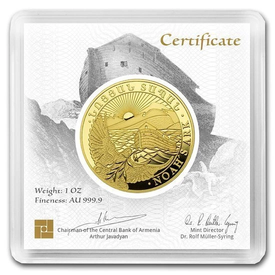 Złota moneta Arka Noego to popularny produkt inwestycyjny, wybity w wadzę1 uncja oraz czystości kruszcu 9999. Ten ciekawy walor jest emitowany przez Centralnego Bank Armenii. Jednakże sam proces produkcyjny odbywa się w prywatnej, niemieckiej mennicy - Leipziger Edelmetall Verarbeitung. Monety z wizerunkiem arki posiadają gwarancję rządu Republiki Armenii co do ich legalności, czystości próby oraz pochodzenia kruszcu, a także są pełnoprawnym środkiem płatniczym na terenie tego kraju. Awers monety, zaprojektowany przez Eduard'a Kurghinyan przedstawia arkę na wzburzonym morzu, na drugim planie widnieje góra Ararat, a w tle widzimy wschodzące słońce. Nazwa góry pochodzi od Ary - bożka z epoki brązu. Ara był bogiem śmierci oraz odrodzenia. W centrum monety znajduje się gołębica w locie nad wodami potopu, trzymająca w dziobie gałązkę oliwną. Na rancie widnieje napis "Arka Noego", w języku angielskim (Noah's ark). Rewers monety przedstawia herb Armenii wraz z wybitym nominałem 50000 dram oraz rokiem wybicia. Z prawej strony, pod herbem, widnieje gramatura oraz próba złota, w której została wybita moneta. Przy dolnym rancie znajduje się napis "Republic of Armenia".Producer