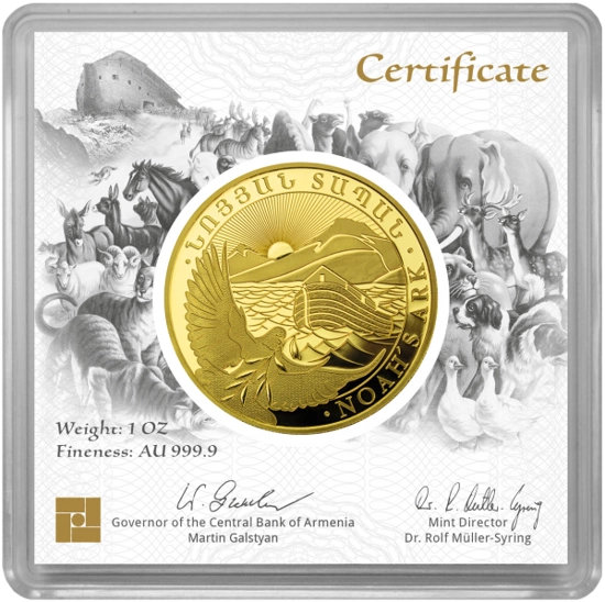 Złota moneta Arka Noego to popularny produkt inwestycyjny, wybity w wadzę1 uncja oraz czystości kruszcu 9999. Ten ciekawy walor jest emitowany przez Centralnego Bank Armenii. Jednakże sam proces produkcyjny odbywa się w prywatnej, niemieckiej mennicy - Leipziger Edelmetall Verarbeitung. Monety z wizerunkiem arki posiadają gwarancję rządu Republiki Armenii co do ich legalności, czystości próby oraz pochodzenia kruszcu, a także są pełnoprawnym środkiem płatniczym na terenie tego kraju. Awers monety, zaprojektowany przez Eduard'a Kurghinyan przedstawia arkę na wzburzonym morzu, na drugim planie widnieje góra Ararat, a w tle widzimy wschodzące słońce. Nazwa góry pochodzi od Ary - bożka z epoki brązu. Ara był bogiem śmierci oraz odrodzenia. W centrum monety znajduje się gołębica w locie nad wodami potopu, trzymająca w dziobie gałązkę oliwną. Na rancie widnieje napis "Arka Noego", w języku angielskim (Noah's ark). Rewers monety przedstawia herb Armenii wraz z wybitym nominałem 50000 dram oraz rokiem wybicia. Z prawej strony, pod herbem, widnieje gramatura oraz próba złota, w której została wybita moneta. Przy dolnym rancie znajduje się napis "Republic of Armenia".Producer
