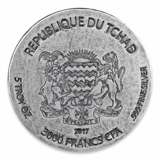 Chad silver coin: ERS Nefertiti 5 oz Silver 2017 Antiqued Coin is a piece that depicts the bust of Nefertiti. She was the wife of the 18th dynasty pharaoh Echnaton. This investment piece is minted in Ag.999 sterling silver, weighing 5 troy ounces and measuring 41mm in diameter, antiqued. The coin is from the Egyptian Relic Series. Its issue is limited to 30,000 pieces and each coin is guaranteed by the Chadian government and is full legal tender in the issuing country. What's more, the renowned Scottsdale Mint is responsible for producing the coin. Each product comes with original certified packaging. The Averse of the silver coin depicts the coat of arms of Chad and information on the issuing country, year of issue, weight, purity of bullion and face value of the coin. The Reverse of the coin features the bust of Nefertiti.