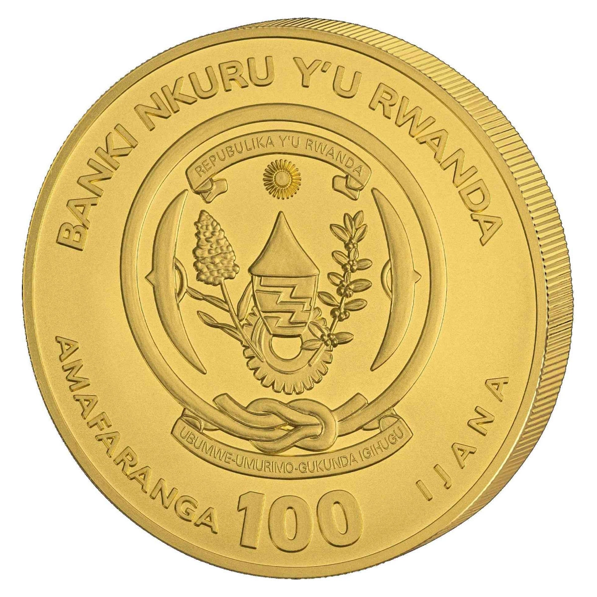 Obverse coat of arms of the Republic of Rwanda, the legend “BANKI NKURU Y’U RWANDA”, national motto, and denomination 100 FRW—an official layout confirming the issue’s legal status.