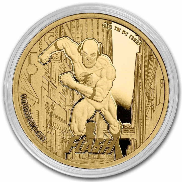 The reverse features the iconic superhero character, Flash. In addition, the reverse side features information about the weight and purity of the gold and the inscription " THE FLASH".