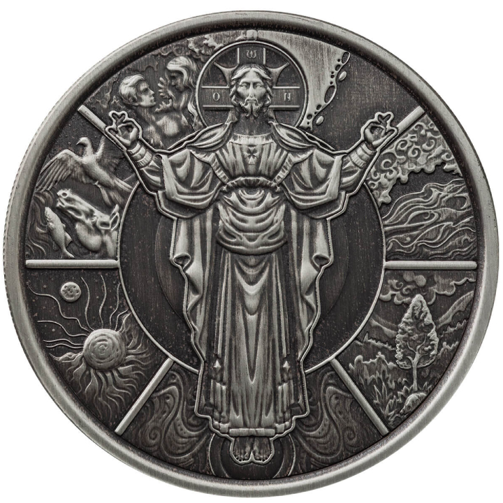 Reverse: The reverse depicts Jesus Christ with the "alpha" and "omega" symbols, surrounded by seven scenes representing the days of Creation.