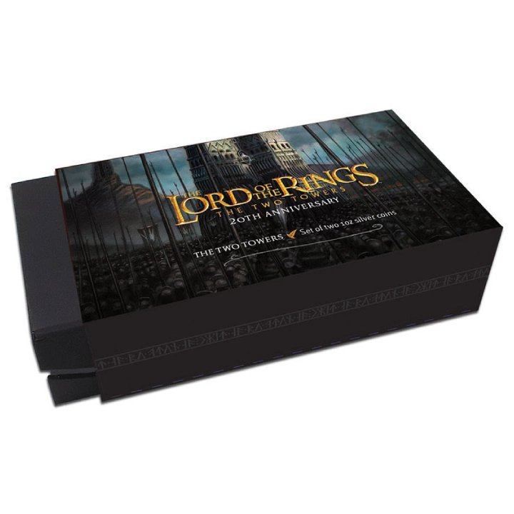 Revs of silver coins depict: Orthanc, the stronghold of the evil sorcerer Saruman, and Barad-dûr, where the spirit of the Dark Lord Sauron resides. The reverse features the inscription 'THE TWO TOWERS', '20th ANNIVERSARY' and the coin's face value. Sacha Lees is responsible for the design of the reverse.