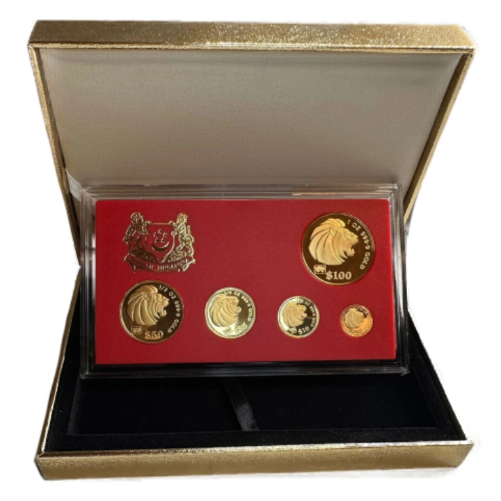 The Singapore Lion: 1995 Pig Privy Mark Gold 5 Coin Set is a unique set of 1, 1/2, 1/4, 1/10 and 1/20 troy ounce gold coins. This set will make an excellent addition to any collection. The coins come in denominations of $5, $10, $25, $50 and $100. These bullion values were produced from pure Au.9999 bullion and The Singapore Mint is responsible for the production of the coins. The Reverse depicts a portrait of a lion and information about the face value, weight and purity of the bullion.The Overt depicts the coat of arms of Singapore and the year of minting.Do you need help? Do you have any questions?Ask a question and we'll respond promptly, publishing the most interesting questions and answers for others.