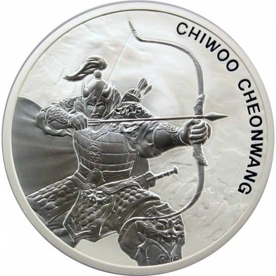 Chiwoo Cheonwang is regarded as a hero in both Chinese and Korean culture. The leader of the Nine Li tribe originating from ancient China. Chiwoo was one of the three legendary founding fathers of China and the 14th Shinshi Emperor, the first semi-legendary state, the cradle of the first Korean nation.The silver medal produced in South Korea by KOMSCO contains 99.9% silver, weighs 1 troy ounce and has a diameter of 40 mm. The coin is the sixth edition of the popular Chiwoo Cheonwang medal series among collectors. The mintage of the coin is 30,000 pieces. The on the obverse side of the medal features a gate from the Chiwoo Empire. On the obverse side, there is also information such as - country of issuer, face value, purity of bullion, year of mintage and manufacturer's logo.On the reverse is an image of Chiwoo Cheonwang with a bow, preparing to attack.Do you need help? Do you have any questions?Ask a question and we'll respond promptly, publishing the most interesting questions and answers for others.