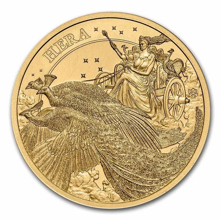 The gold coin depicting Hera is a product made of pure Au.9999 bullion, weighing 1/4 troy ounce and measuring 22.5mm in diameter. Hera in Greek mythology is the goddess of fertility and the patroness of marriage and motherhood. She was the wife of Zeus.This coin is guaranteed by the government of St Helena and is a full-fledged means of payment in this country. Importantly, it is a gold piece and has a strictly limited mintage of 1,000 pieces. It is therefore worth taking an interest in this coin, as well as the entire series. The coin was placed in an individual, original packaging. The Overt of the gold coin depicts a portrait of Queen Elizabeth II and information on the face value, date of issue and issuing country. The designer of the obverse was Jody Clark. The Rewers shows the figure of Hera riding in a chariot drawn by sacred peacocks, with their tails covered by hundreds of the ever-watchful eyes of the mighty Argus, called the so-called Argus eyes. The reverse was designed by Joel Iskowitz.