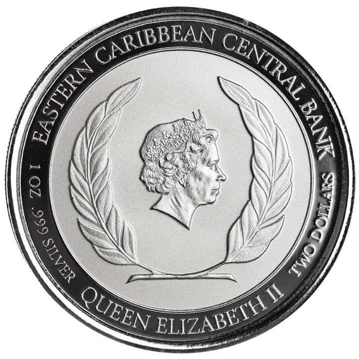 The obverse of the silver coin features the likeness of Queen Elizabeth II and the inscriptions 'QUEEN ELIZABETH II' and 'EASTERN CARIBBEAN CENTRAL PARK'. The obverse also shows the weight, purity of the bullion and face value of the coin. The Rewers depicts a woman swimming underwater with a surfboard. The reverse also bears the inscription "ST. KITTS & NEVIS" and the year of issue.