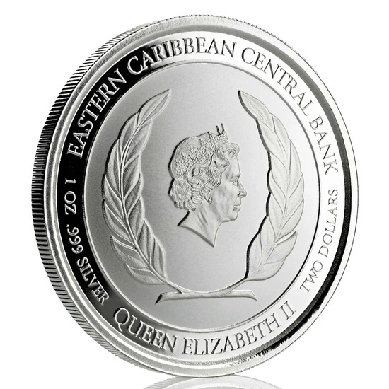 St. Lucia: Flamingo 1 oz Silver 2019 is a silver coin, part of the EC8 (Eastern Caribbean Coin Program) collector programme. EC8 is an eight-coin series issued by islands such as Antigua and Barbuda, Dominica, Grenada, St Kitts and Nevis, St Lucia, St Vincent and the Grenadines, Anguilla and Montserrat (each of the aforementioned islands is a member of the Eastern Caribbean Central Bank). Each release of the EC8 represents a different island and has its own individual image. The Flamingo is a coin that is minted in pure Ag.999 silver, with a weight of one troy ounce and a diameter of 39 mm. It is limited to a mintage of 25,000 pieces and is issued by US precious metals producer Scottsdale Mint. In addition, each silver coin is packaged in a plastic cap.The Overt of the coin features a portrait of Queen Elizabeth II and information on the issuing country, weight, bullion proof and denomination of the coin.