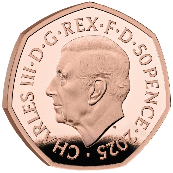 Obverse features a portrait of King Charles III, designed by Martin Jennings, along with the coin’s denomination and year of issue.