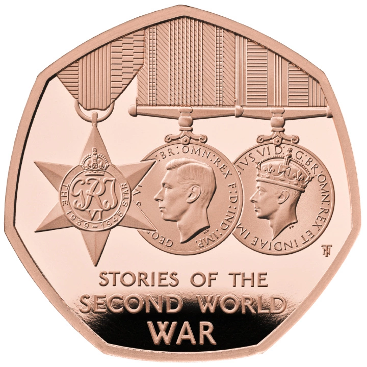 Stories of The Second World War 50p Gold 2025 Proof is a coin commemorating the heroism and determination of those who fought and survived one of the most challenging periods in history. The Second World War posed an existential threat to Great Britain, yet both soldiers on the front lines and civilians on the home front displayed extraordinary courage in fighting against Nazi Germany and its allies. This coin pays tribute to their history and sacrifice, emphasizing the importance of personal stories in preserving the memory of the war.