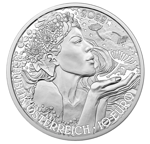 The coin The Dandelion 10 Euro Silver 2022 is a coin from the series The language of flowers, with a denomination of 10 Euro. The dandelion is the second coin in the series. The next flowers in the series will be marigold, forget-me-not, chamomile, peony and violet. The product has a silver purity of Ag.925, a weight of 16.82 grams and a diameter of 32 mm. The mintage of the coin is 30,000 pieces.Flowers are a form of showing affection, love, congratulations, apologies, thanksgiving or condolences. Each of the flowers in The Language from Flowers series has different characteristics or uses. The series is designed to revisit the meaning of each flower.Dandelion is a common plant with beneficial but forgotten properties. It is commonly thought of as a field weed, however, the appropriate use of dandelion can provide relief for a variety of ailments. In the language of flowers, the dandelion symbolises "a wish fulfilled".The coin comes from the renowned Austrian Mint. The 2022 silver coin has no minted weight or bullion proof. The Averse shows a woman with flowers in her hair blowing the seeds of a dandelion, commonly referred to as a "blowfly". The obverse also shows the mintage year of the coin, the denomination and the inscription "REPUBLIK ÖSTERREICH".The Rewers depicts a dandelion, which creates the impression imprinted on the coin.Packaging for the product