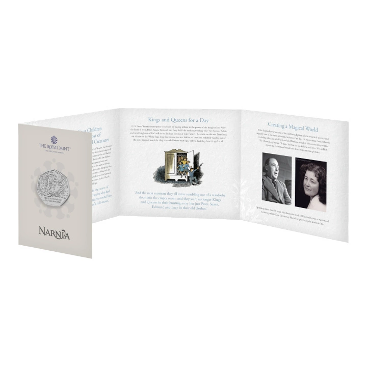 Reverse the coin depicts the faun of Mr. Tumnus and Lucia and the inscription "THE LION, THE WITCH AND WARDROBE"". Ffion Gwillim is responsible for the reverse design.