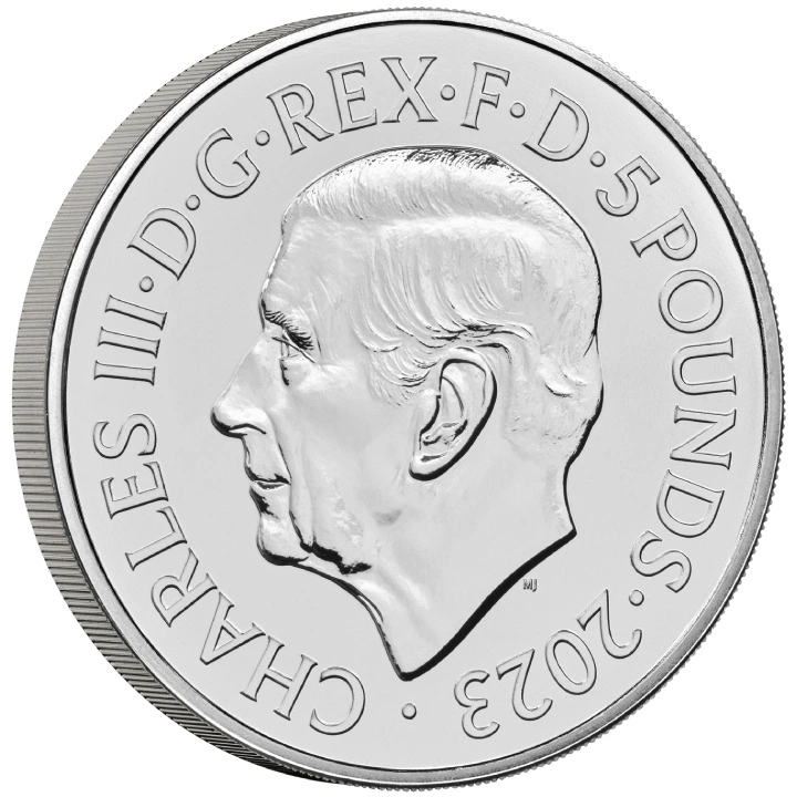 Obverse shows the likeness of King Charles III of Great Britain wearing a crown, the inscription "CHARLES III∙D∙G∙REX∙F∙D" and the denomination and year, designed by Martin Jennings.