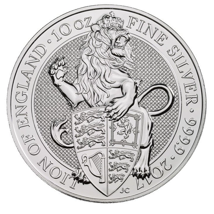 The obverse: The obverse features an image of Queen Elizabeth II designed by Jody Clark. Here we can also find information about the denomination. Rewers: shows a stylised image of an English Lion holding the shield of the Royal Family , as well as information about the weight (10 oz), the purity (0. 9999 Ag) and the year of mintage (2017).