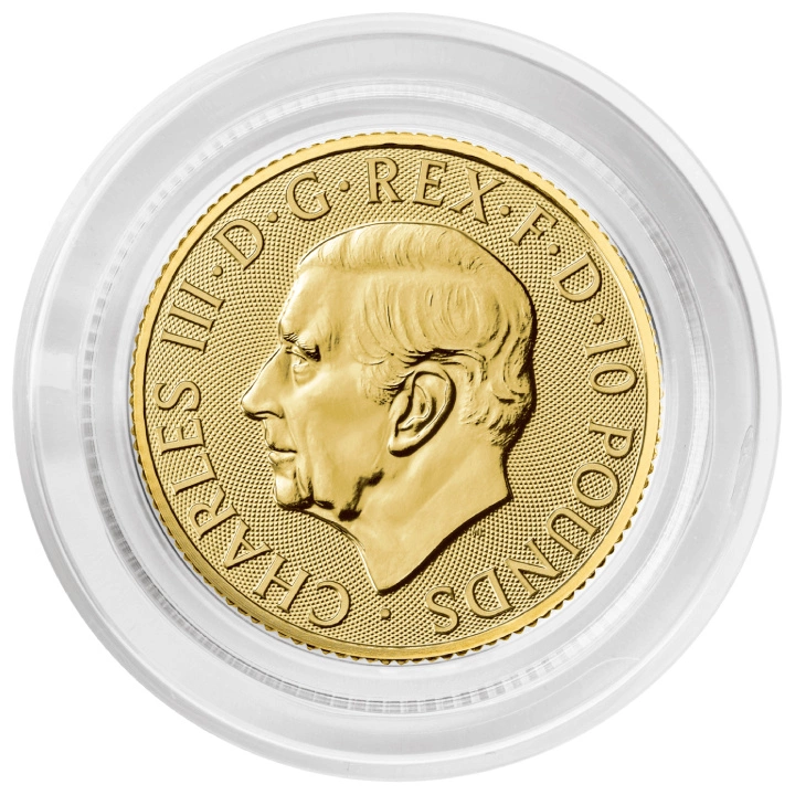 On the obverse of the coin is immortalised a portrait of King Charles III of Great Britain, designed by Martin Jennings. II. One can also find information on the face value of the coin. The Rewers shows an illustration of a modified coat of arms of Great Britain, designed by the talented designer Timothy Noad. The aforementioned coat of arms features an image of an English lion and a Scottish unicorn, both of which guard the Army Coat of Arms of the United Kingdom of Great Britain and Northern Ireland. Interestingly, the inspiration for the contemporary image of the gold coin was the symbolic design of The Royal Arms by Eric Sewell. The reverse also features information on weight, bullion purity and date of issue.
