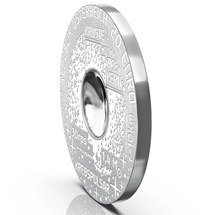 The obverse depicts a neutron star that formed from a supernova in the year 1054. On the obverse, there are also the inscriptions: "KRUSTE", "KERN", "KREBSPULSAR" as well as the year of minting of the coin, the denomination and "REPUBLIK ÖSTERREICH".The Rewers shows a coloured, convex neutron star and the inscription "NEUTRONESTERN".