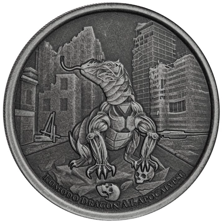 Tokelau: Komodo Dragon A.I. Apocalypse 1 Ounce Silver 2022 Antiqued Coin is a unique product that depicts an automated Komodo Varanus. With its razor-sharp metal claws and matching intellect, the robot dragon is quickly surpassing the wildest dreams of its creators.