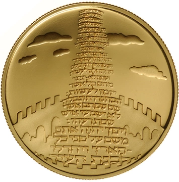 Tower of Babel 10 NIS Gold 2002 Proof is the 7th coin in the "Biblical Art" series. The copy depicts the Tower of Babel, formed by biblical verses.