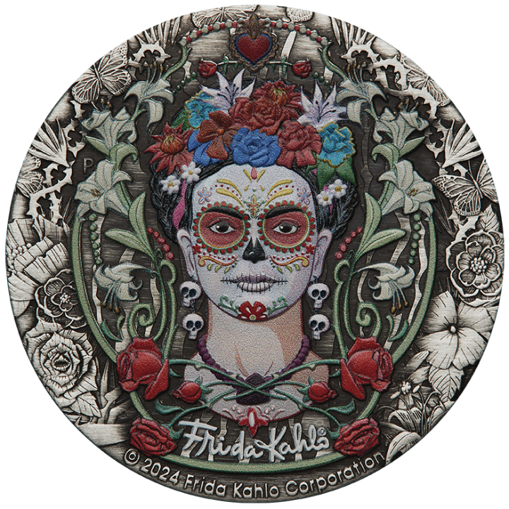 Tuvalu: Frida Kahlo Coloured 2 oz Silver 2024 Antiqued Coin is a unique offering featuring Frida Kahlo - a painter famous for her self-portraits in which she explored identity, pain and relationships. Her art was connected to the culture of Mexico and often included folk elements and references to mythology. Frida became an icon of feminism, symbolising strength and perseverance in the face of hardship