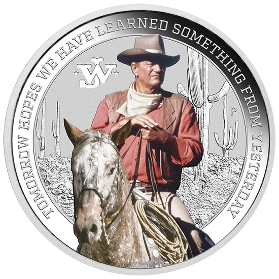 Ponadto, za emisję tego srebrnego, bulionowego egzemplarza odpowiada najstarsza australijska mennica The Perth Mint. Warto także dodać, iż całość jest bita na zlecenie państwa Tuvalu, co za tym idzie każdy egzemplarz posiada gwarancję rządu Tuvalu oraz stanowi legalny środek płatniczy na terenie tego kraju.Awers przedstawia Królową Elżbietę II – projektu Ian’a-Rank’a Broadley’a, wraz z informacją o roku wybicia, próbie kruszcu, wadze, kraju emitenta oraz wartości nominalnej waloru. Rewers srebrnej monety przedstawia kolorowany wizerunek John'a Wayne na koniu oraz napis "TOMORROW HOPES WE HAVE LEARNED SOMETHING FROM YESTERDAY".