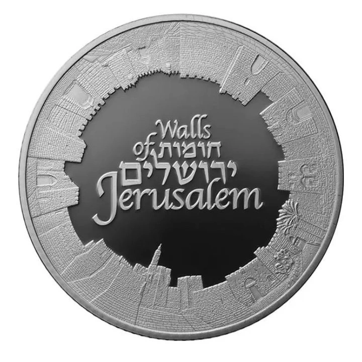 The obverse shows a view of the walls of the old city of Jerusalem and the inscription "WALLS OF JERUSALEM", according to a design by Aharon Shevo.